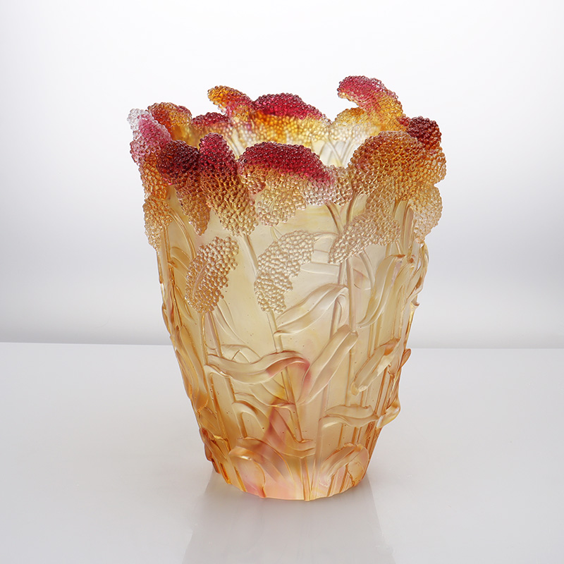 A cirokkalászok réteges, megolvasztott viaszformákat igényelnek: Minden egyes „szemcse” gömbölyded gömbölyűsége a viasz áramlási feszültségének szabályozásától függ; levélér precíziós vizsgálatok fémforma gravírozás pontosságát. Az elveszett viasz öntésének szubtraktív logikája (a viasz elolvadása, az olvadt üveg öntése) mikroszkopikus formákat szabadít fel a mechanikai replikáció hidegsége alól, és a „szél által sodort szemcsehullámok” dinamikus illúzióját generálja – a hullámzó hegyek és a hullámos levelek a fényben és az árnyékban lélegeznek.